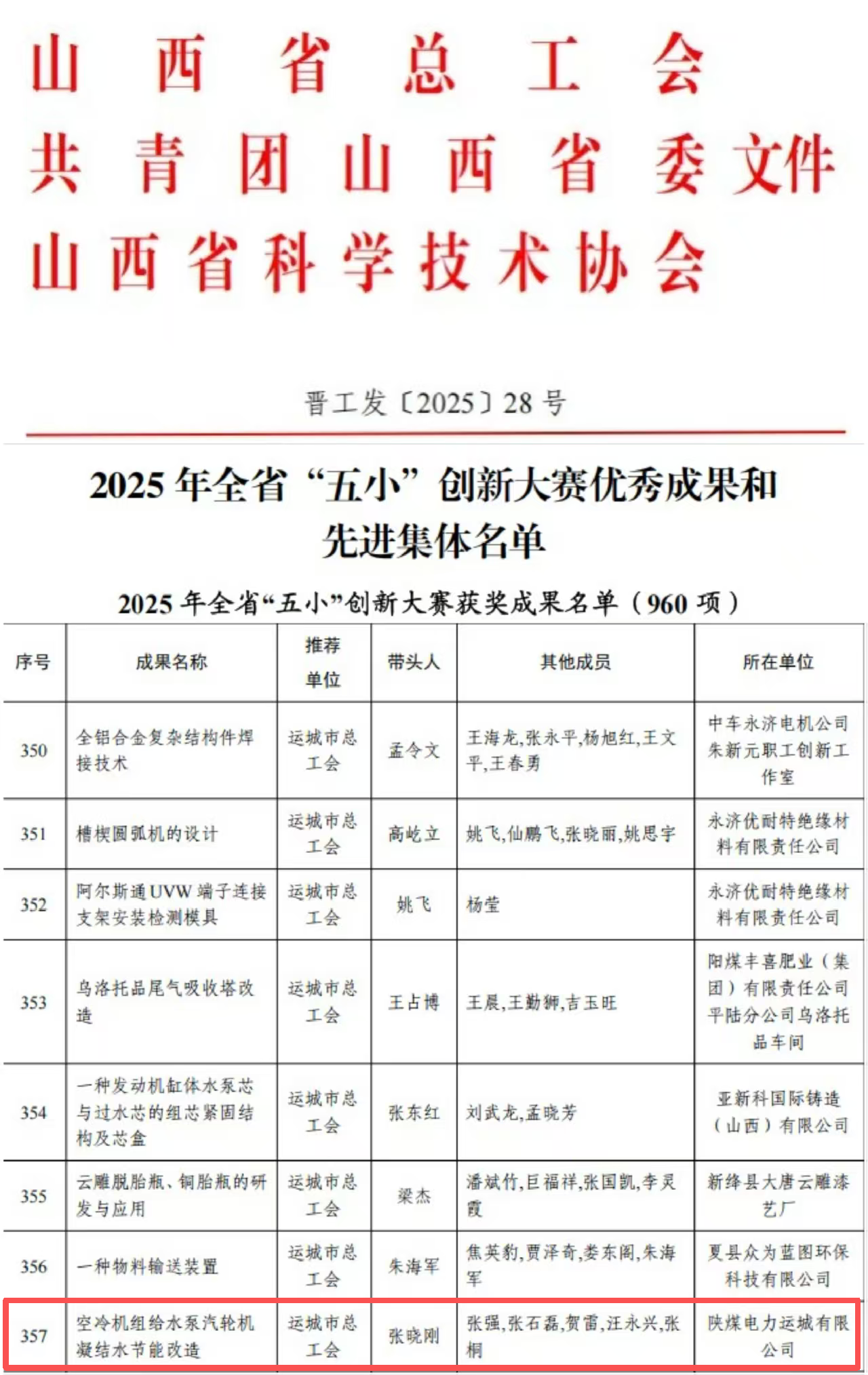 近日,在山西省总工会、共青团山西省委、山西省科学技术协会联合举办的2025年全省“五小”创新大赛中,陕煤运电特级技师、创新工作室带头人张晓刚领衔的《空冷机组给水泵汽轮机凝结水节能改造》项目荣获优秀成果三等奖。